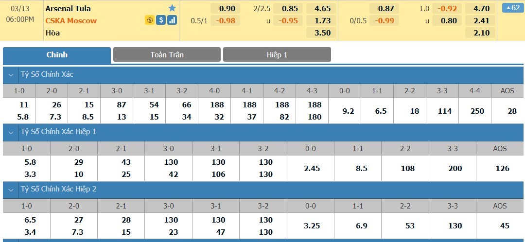 Tip kèo tỷ số hiệp 1: Arsenal Tula 0-0 CSKA Moscow