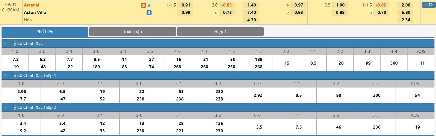 Trong 5 trận đấu gần nhất hai đội bóng này chạm trán trực tiếp nhau, Arsenal đã có 2 trận đấu mang về được cho mình ít nhất là 1 bàn thắng trong hiệp đấu đầu tiên trong khi Aston Villa đã mang về 3 lần. Tỷ lệ kèo hiệp 1 ở trận đấu này được đưa ra là -1/2 trái và người chơi nên tin tưởng vào đội chủ nhà.