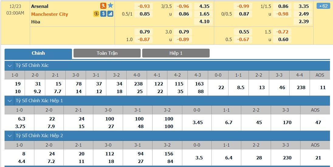 Tip kèo tỷ số hiệp 1: Arsenal 0-1 Manchester City