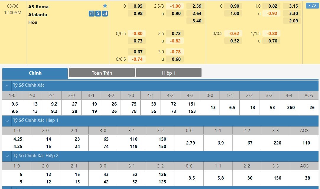 Tip kèo tỷ số hiệp 1: AS Roma 1-1 Atalanta