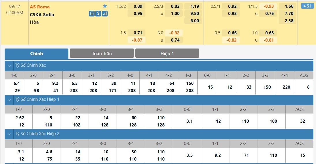 Tip kèo tỷ số hiệp 1: AS Roma 1-0 CSKA-Sofia