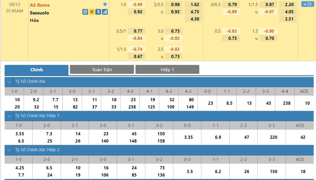 Tip kèo tỷ số hiệp 1: AS Roma 1-0 Sassuolo