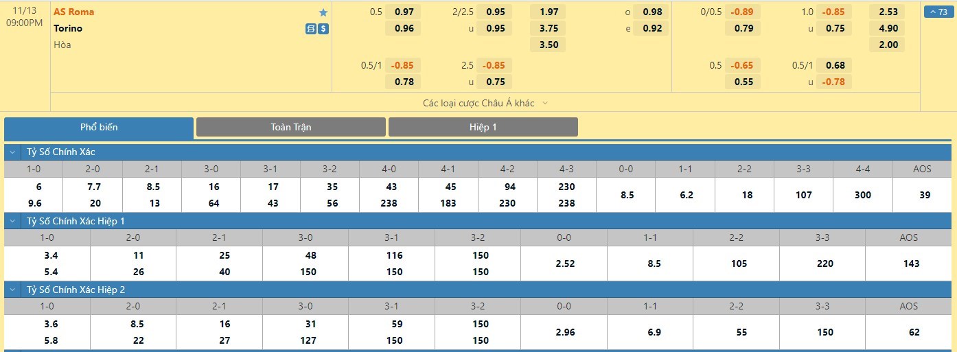 Trong 5 trận đấu gần nhất đôi bên đụng độ nhau trực tiếp, AS Roma đã có 5 trận đấu mang về được cho mình ít nhất là 1 bàn thắng trong hiệp đấu đầu tiên. Còn với Torino, đội bóng này chỉ có 1 lần làm được điều này trong 45 phút đầu tiên. Với tỷ lệ kèo hiệp 1 ở trận đấu này được đưa ra là -1/4 trái thì người chơi nên tin tưởng vào đội chủ nhà trận này.