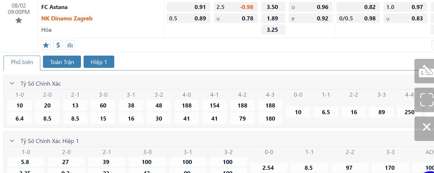 Tip kèo tỷ số hiệp 1: Astana 0-0 Dinamo Zagreb