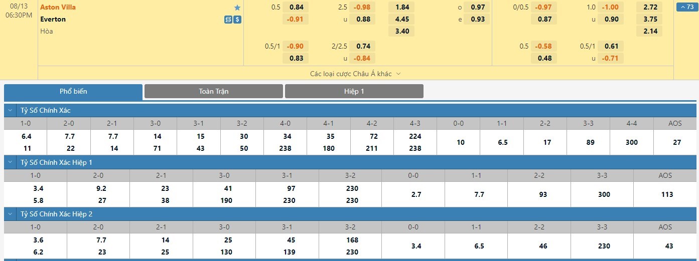 Ở 5 trận đối đầu gần đây nhất với nhau, đã có 1 lần Aston Villa vươn lên dẫn trước đối thủ ở trong hiệp 1, trong khi đó 4/5 trận đấu còn lại kết thúc với việc bất phân thắng bại. Tuy vậy, Aston Villa thời gian qua đang tỏ ra mình không quá mạnh trong hiệp 1 khi họ không thể có bàn thắng ở 4/5 trận đấu gần nhất. Hơn nữa, Everton cũng là đội bóng thi đấu không quá nổi bật ở hiệp 1 khi ho chỉ có 2/5 lần xuyên thủng được mành lưới đối phương sau hiệp 1. Những cuộc đọ sức giữa Aston Villa và Everton thường có xu hướng diễn ra giằng co và không có nhiều pha lập công xuất hiện. Tính trong 6 màn đụng độ gần nhất giữa hai đội thì chỉ có 2 trận xuất hiện từ 3 bàn thắng trở lên.