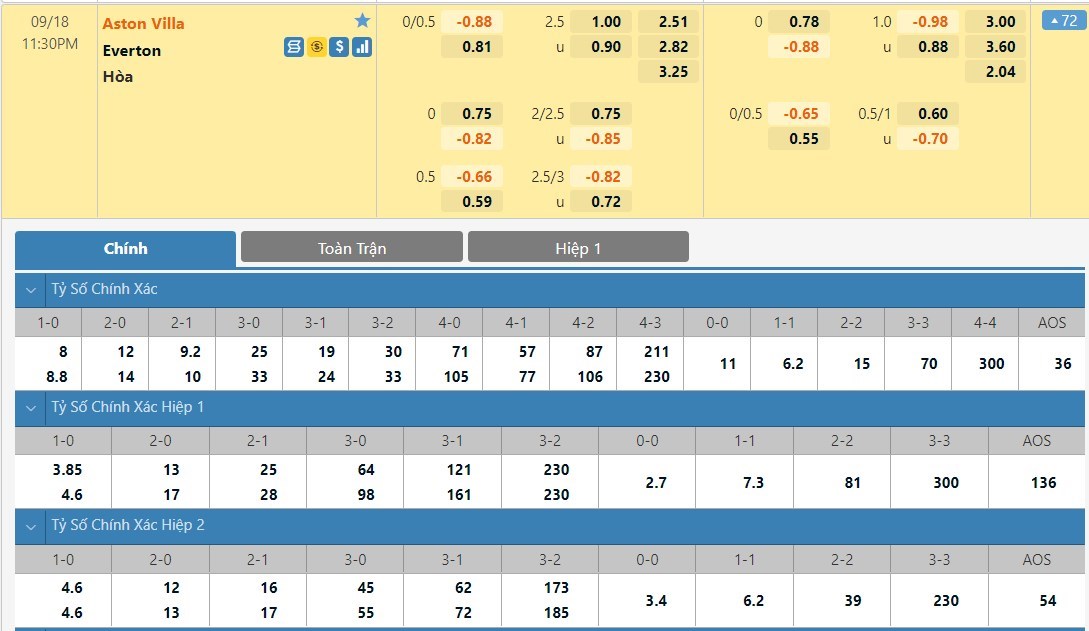 Tip kèo tỷ số hiệp 1: Aston Villa 0-0 Everton