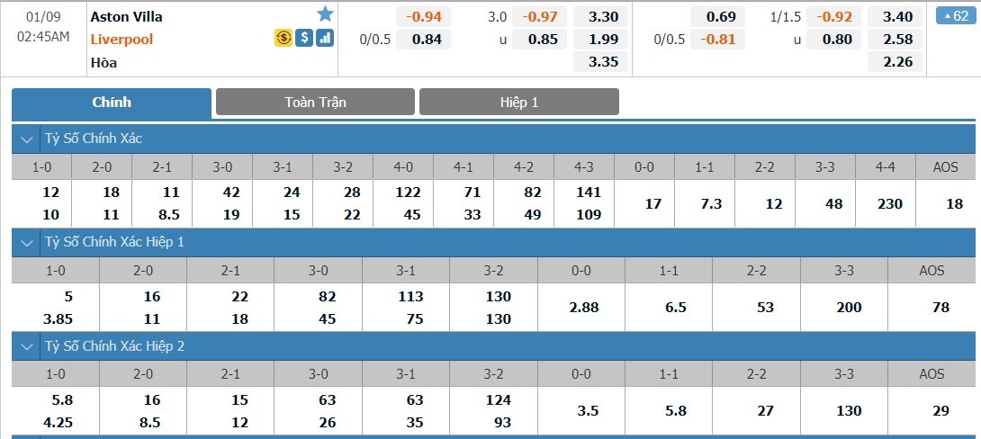 Tip kèo tỷ số hiệp 1: Aston Villa 0-0 Liverpool