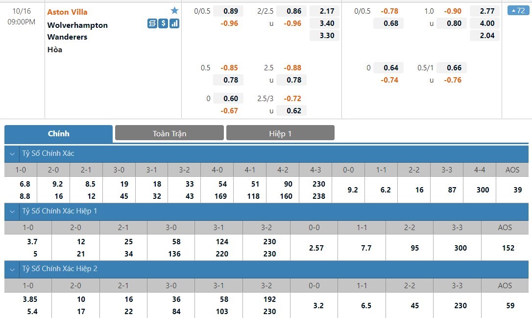 Khả năng đôi bên chia điểm ở trận cầu tới càng trở nên khả thi hơn khi chúng ta nhìn vào thành tích đối đầu của họ. Cụ thể trong 5 lần gần nhất đôi bên đụng độ thì mỗi bên đều có cho mình 2 chiến thắng. Còn ở trận lượt về của mùa giải năm ngoái Aston Villa và Wolverhampton đã bất phân thắng bại. Do đó ở kèo châu Âu thì hòa được cho là lựa chọn khôn ngoan của người chơi. Bàn thắng luôn là thứ cực kỳ xa xỉ trong những cuộc đọ sức giữa Aston Villa và Wolverhampton. Thống kê cho thấy ở 3 lần gần nhất 2 đội gặp nhau thì đôi bên chỉ mang đến tổng cộng 2 bàn thắng. Nghĩa là tỷ lệ trung bình còn chưa tới 1 bàn 1 trận. Vì vậy mà ở kèo đấu này thì xỉu sẽ là lựa chọn mang tới cơ hội ăn cao hơn.