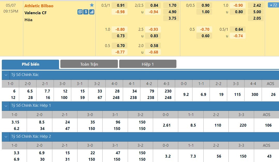 Tip kèo tỷ số hiệp 1: Athletic Bilbao 0-0 Valencia