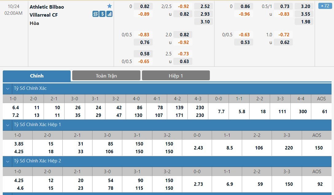 Tip kèo tỷ số hiệp 1: Athletic Bilbao 0-0 Villarreal