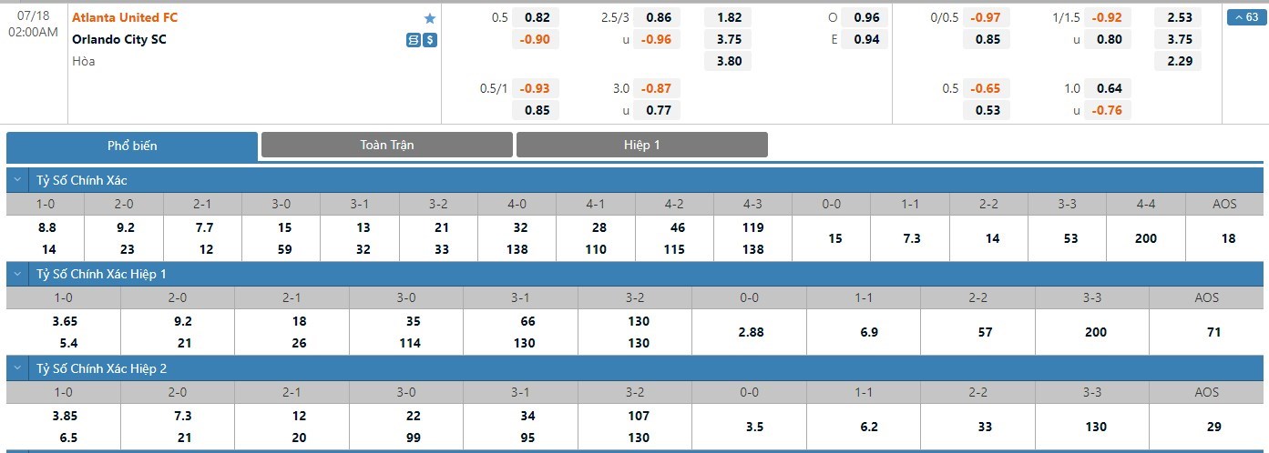 Với lợi thế sân nhà thì Atlanta United vẫn được đánh giá nhỉnh hơn. Nhà cái xếp đội chủ nhà ở thế kèo trên chấp tỷ lệ -1/2 trái. Một điểm cần lưu ý đó là trong lần gần nhất hai đội đụng độ thì Atlanta United đã giành chiến thắng cách biệt 3 bàn trước Orlando City. Song nó cũng là lần duy nhất mà Atlanta United giành thắng lợi tính trong 7 lần gặp gỡ trở lại đây giữa đôi bên.