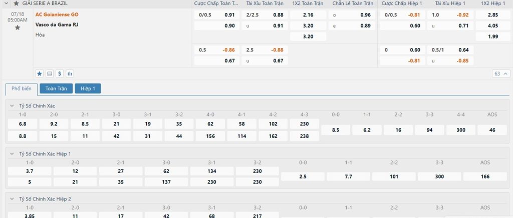 Tip kèo tỷ số hiệp 1: Atletico GO 0-0 Vasco da Gama