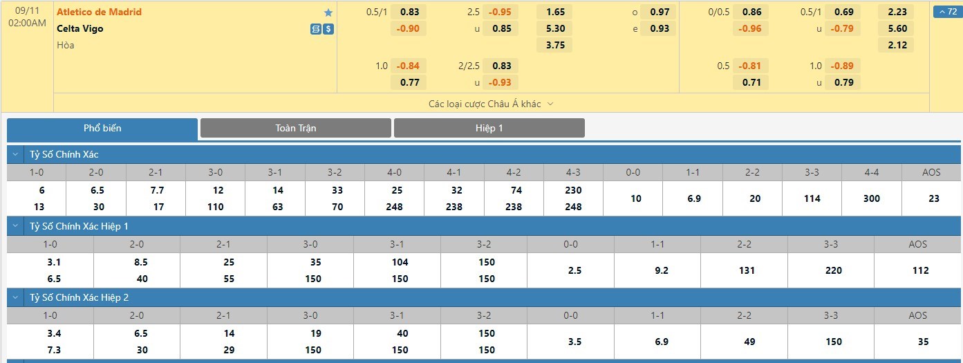 Tip kèo tỷ số hiệp 1: Atletico Madrid 1-0 Celta Vigo