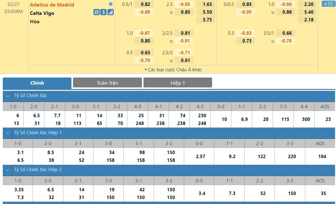 Tip kèo tỷ số hiệp 1: Atletico Madrid 0-0 Celta Vigo