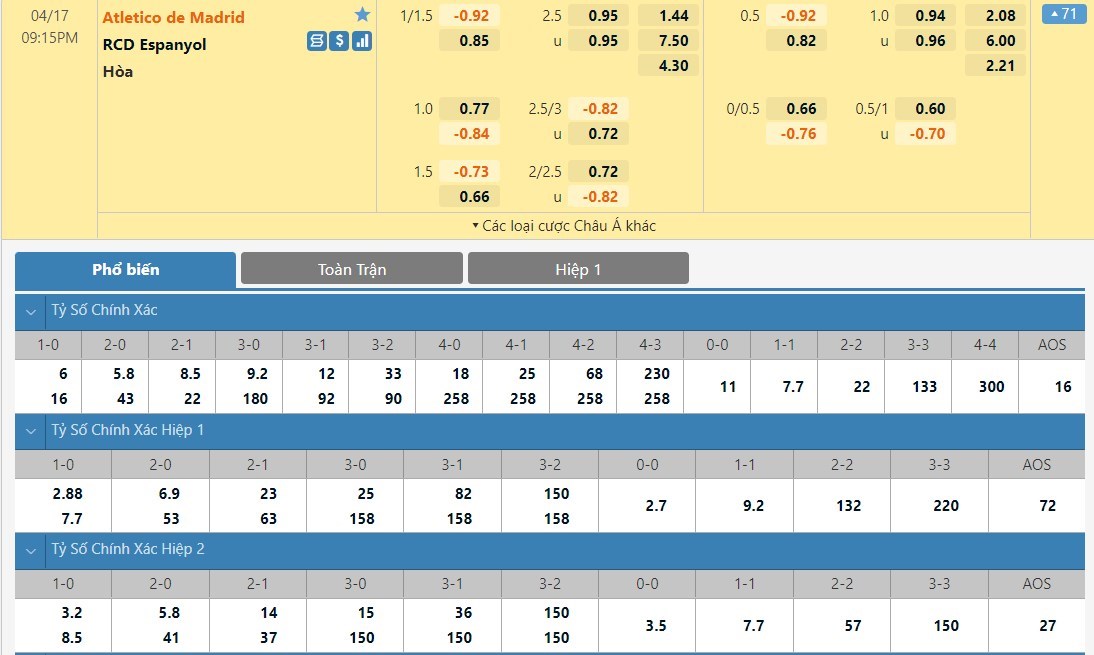 Tip kèo tỷ số hiệp 1: Atletico Madrid 1-0 Espanyol