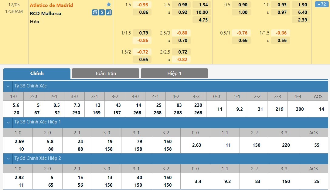 Tip kèo tỷ số hiệp 1: Atletico Madrid 1-0 Mallorca