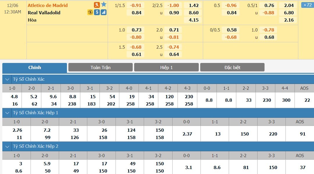 Tip kèo tỷ số hiệp 1: Atletico Madrid 1-0 Real Valladolid