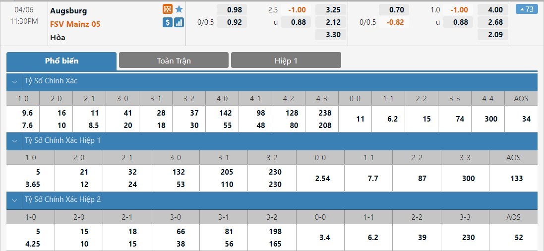 Tip kèo tỷ số hiệp 1: Augsburg 1-1 Mainz 05