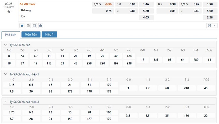 Tip kèo tỷ số hiệp 1: AZ Alkmaar 1-0 Elfsborg