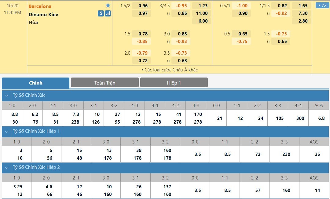 Tip kèo tỷ số hiệp 1: Barcelona 1-0 Dinamo Kiev