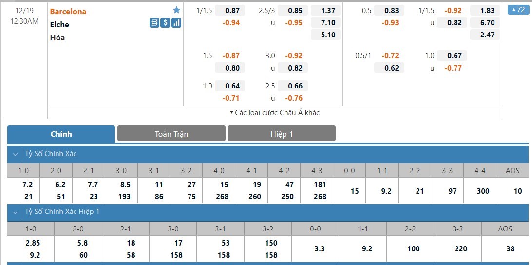 Tip kèo tỷ số hiệp 1: Barcelona 1-0 Elche