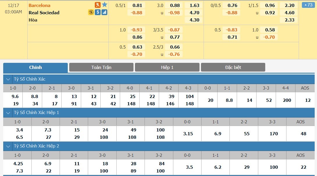 Lionel Messi không còn duy trì được phong độ cao ở mùa giải năm nay và lối chơi của Barcelona đang thiếu đột biến. Ở cả 3 trận đấu gần nhất của mình, Barcelona đều là cửa cược thua kèo. Phía bên kia chiến tuyến, Real Sociedad vẫn đang duy trì được một lối chơi cực kì khó chịu và họ là cái tên rất khó bị đánh bại lúc này. Đã liên tiếp 10 trận đấu trôi qua, Real Sociedad đều bất bại. Với tỷ lệ chấp 3/4 trái, cửa dưới Real Sociedad sẽ là lựa chọn hợp lý hơn cho kèo đấu này.