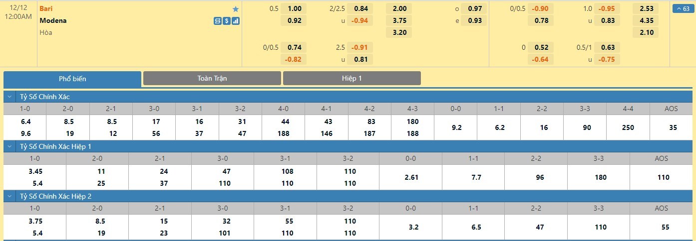 Tip kèo tỷ số hiệp 1: Bari 0-0 Modena