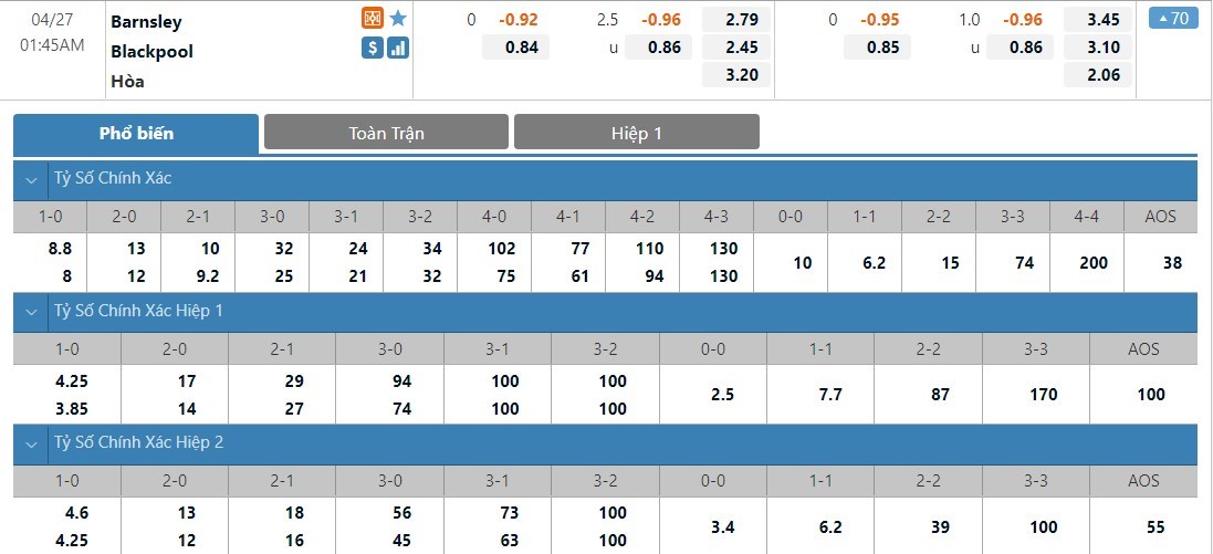 Tip kèo tỷ số hiệp 1: Barnsley 0-0 Blackpool