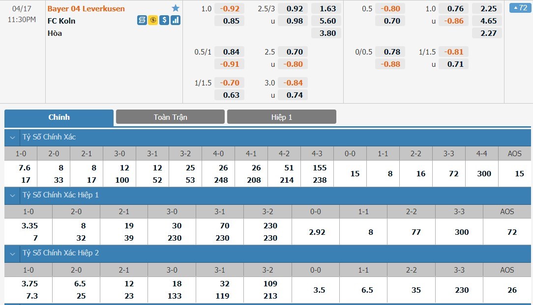 Tip kèo tỷ số hiệp 1:Bayer Leverkusen 2-0 FC Koln