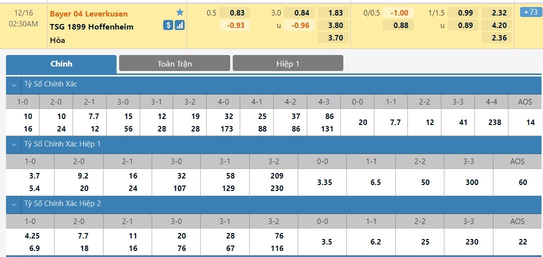 Tip kèo tỷ số hiệp 1: Bayer Leverkusen 1-1 Hoffenheim