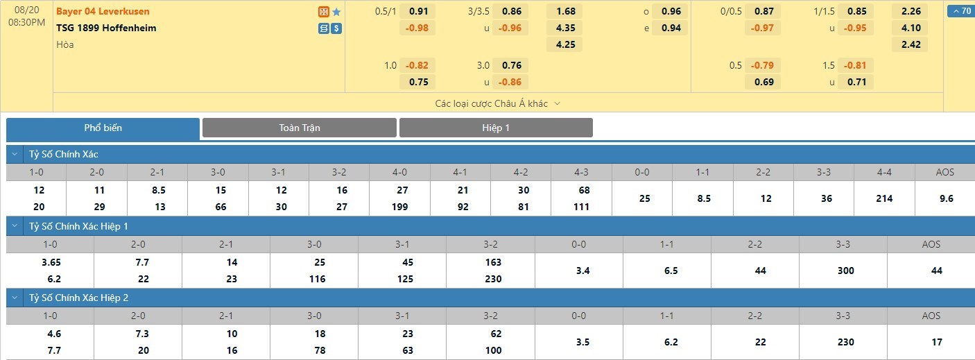 Nếu như Bayer Leverkusen đã có được cho mình 2 trận đấu mang về 1 bàn thắng trong hiệp đấu đầu tiên ở 5 trận gần nhất thì Hoffenheim đã có 3 lần làm được điều này. Với tỷ lệ kèo hiệp 1 là -1/4 trái thì người chơi nên tin tưởng vào đội khách để mang về cơ hội thắng cao hơn. Tính trong 10 lần đụng độ gần nhất giữa hai đội thì có đến 8 trận xuất hiện bàn thắng ngay trong hiệp 1.