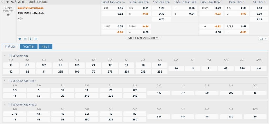 Tip kèo tỷ số hiệp 1: Bayer Leverkusen 2-1 Hoffenheim