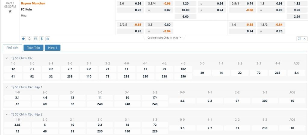 Tip kèo tỷ số hiệp 1: Bayern Munich 1-0 FC Koln