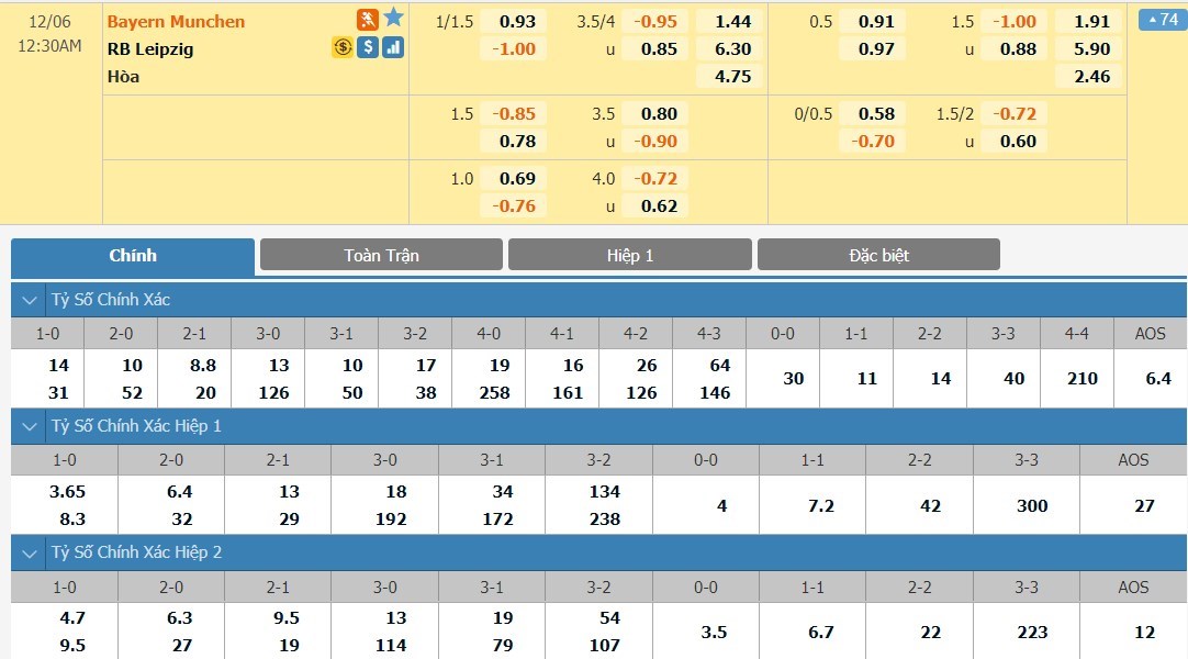 Tip kèo tỷ số hiệp 1: Bayern Munich 1-0 RB Leipzig