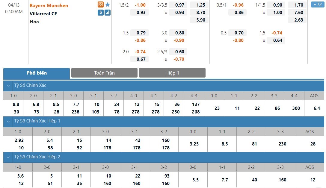 Tip kèo tỷ số hiệp 1: Bayern Munich 1-0 Villarreal