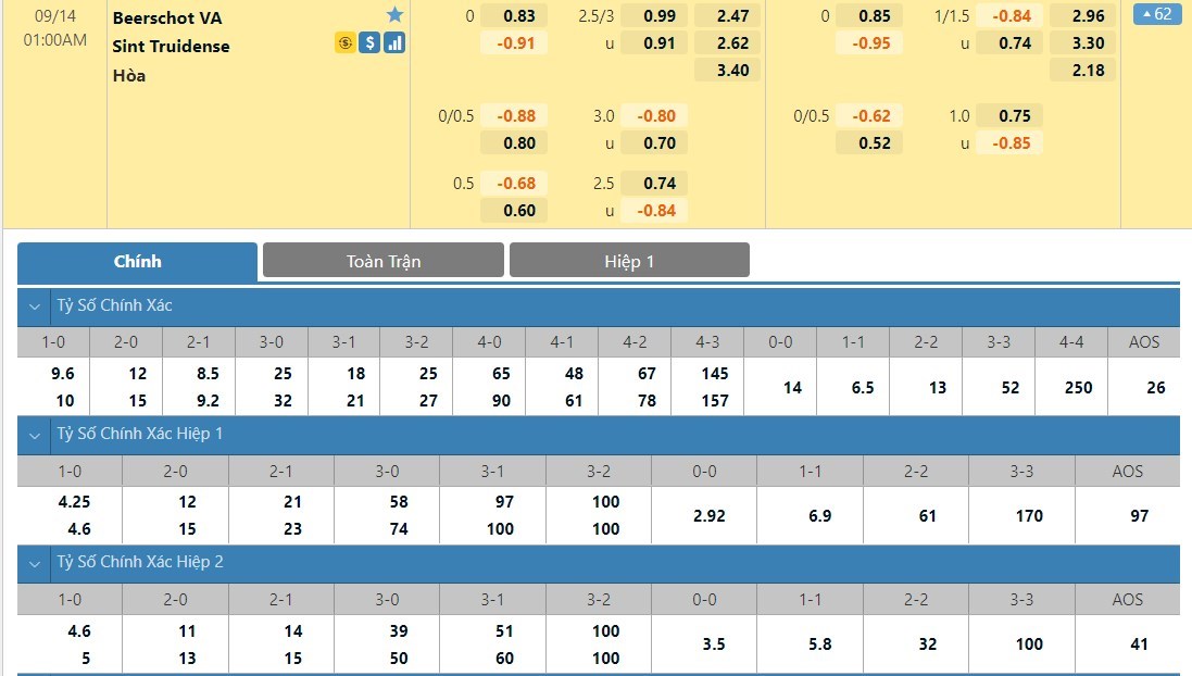 Tip kèo tỷ số hiệp 1: Beerschot 0-0 St.Truiden