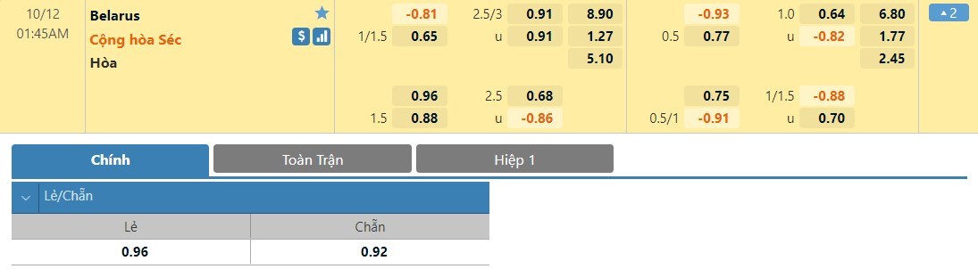Tip kèo tỷ số hiệp 1: Belarus 0-1 Cộng hòa Séc