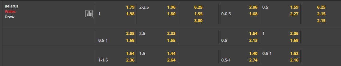 Khả năng có bàn thắng trong hiệp 1 là khá thấp theo đánh giá của chuyên gia. Trong khi đội cửa trên là xứ Wales vốn sở dĩ lối đá có phần thực dụng và không quá mạnh ở hàng công, còn Belarus thì gần như chắc chắn sẽ lựa chọn đá thủ để giành điểm trước đối thủ mạnh. Chính vì vậy, với kèo chấp hiệp đấu này Belarus là đội mà người chơi nên đầu tư khi họ được chấp 0.25 bàn trong hiệp 1. Khoảng thời gian hiệp 2 khi tốc độ trận đấu được gia tăng sẽ là lúc bàn thắng xuất hiện.