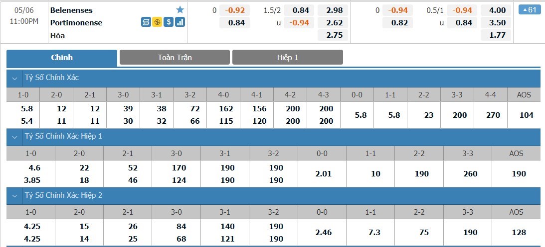 Tip kèo tỷ số hiệp 1: Belenenses 0-0 Portimonense