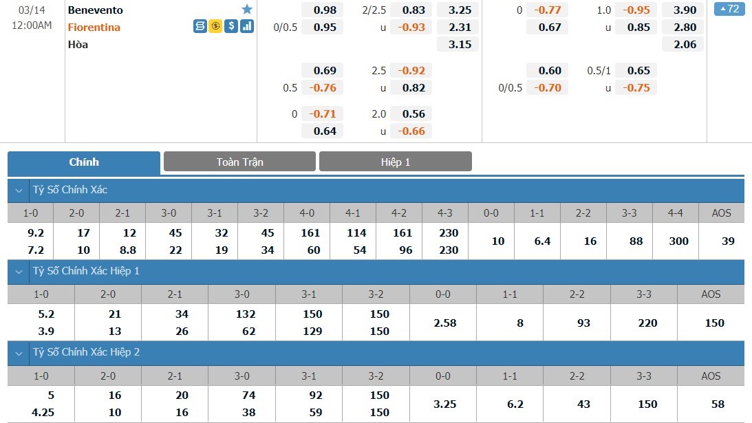 Tip kèo tỷ số hiệp 1: Benevento 0-0 Fiorentina