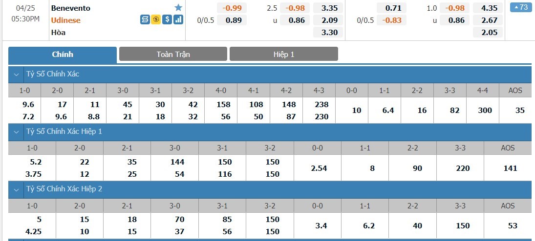 Tip kèo tỷ số hiệp 1: Benevento 0-0 Udinese