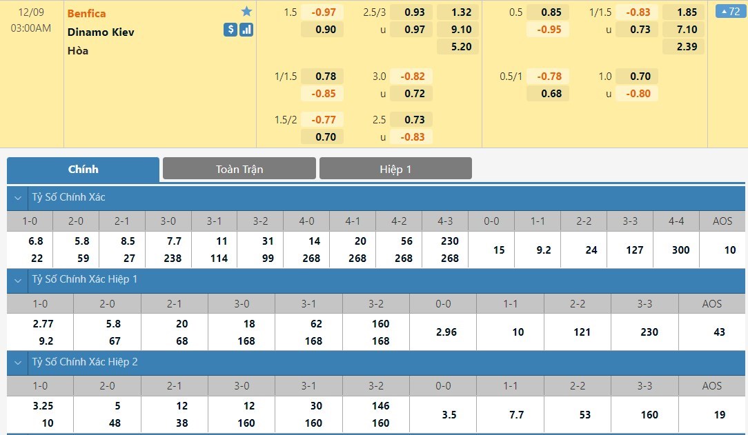 Tip kèo tỷ số hiệp 1: Benfica 1-0 Dynamo Kyiv