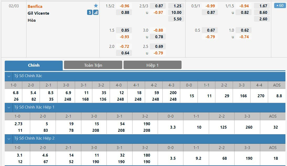 Tip kèo tỷ số hiệp 1: Benfica 1-0 Gil Vicente