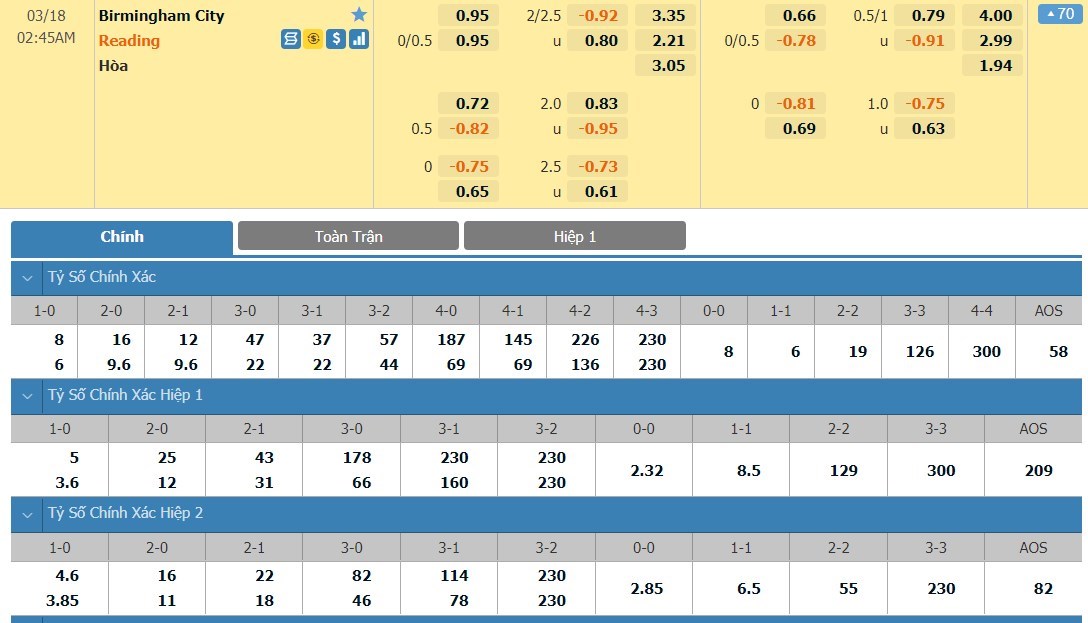 Tip kèo tỷ số hiệp 1: Birmingham City 0-0 Reading