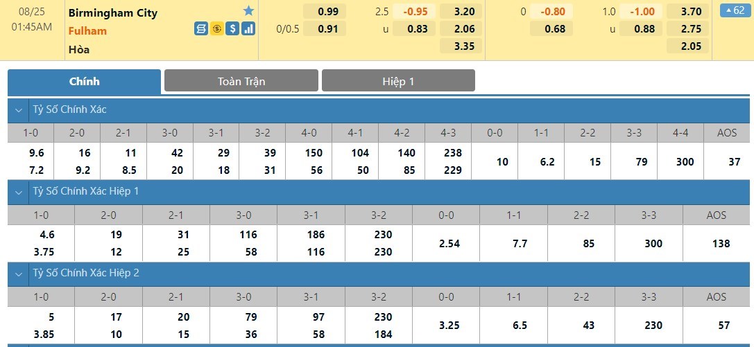 Tip kèo tỷ số hiệp 1: Birmingham 0-0 Fulham