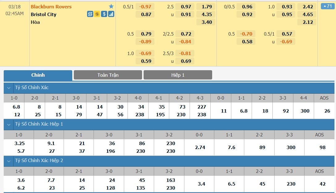 Tip kèo tỷ số hiệp 1: Blackburn Rovers 0-0 Bristol City