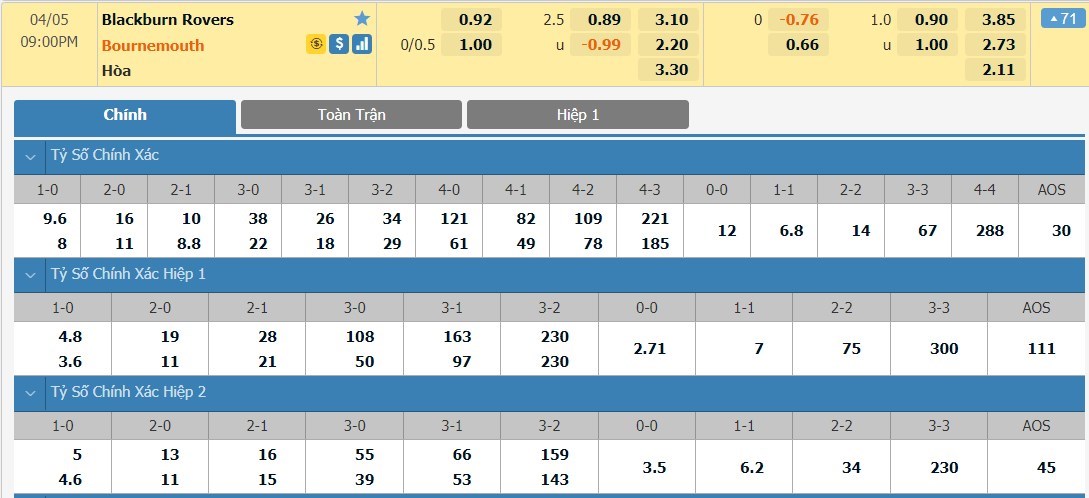 2 cuộc đối đầu gần nhất giữa Blackburn và Bournemouth đều kết thúc với 5 bàn thắng được khi mỗi trận. Đội chủ nhà Blackburn với hàng phòng thủ lỏng lẻo rất dễ bị khai thác là cơ sở để chọn Tài ở trận này. Trong khi đó, Bournemouth với 3 trong số 4 trận gần nhất đều có số bàn thắng từ 3 trở lên, cộng với việc hàng công của họ thi đấu rất cháy ở mùa này với 55 bàn trong 37 trận. Trung bình mỗi trận nổ súng 1.48 lần.