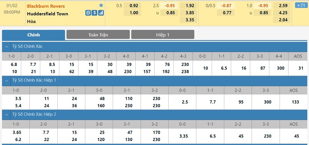 Tip kèo tỷ số hiệp 1: Blackburn 1-1 Huddersfield