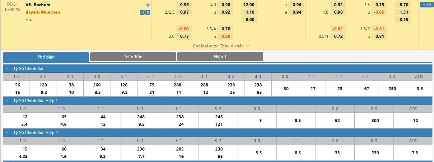 Tỷ lệ kèo được đưa ra ở cuộc đối đầu này là -2 1/4 trái nghiêng về Bayern Munich và điều này là hoàn toàn không có gì bất ngờ. Ở 5 lần gần nhất hai đội bóng này chạm trán nhau thì Hùm Xám đã mang về cho mình tới 4 thắng lợi. Xét trên nhiều khía cạnh, Bochum hoàn toàn thua kém Bayern Munich. Nhà cái đưa ra mốc chấp sâu đã đủ nói lên chênh lệch trình độ giữa đôi bên. Để mang về cho mình cơ hội thắng kèo cao hơn thì các nhà đầu tư nên tin tưởng vào đoàn quân của HLV Julian Nagelsmann ở cuộc đối đầu này. Với tỷ lệ kèo hiệp 1 là đội khách chấp tỷ lệ -1 trái thì người chơi nên tin tưởng vào đội khách để mang về cơ hội thắng cao hơn.