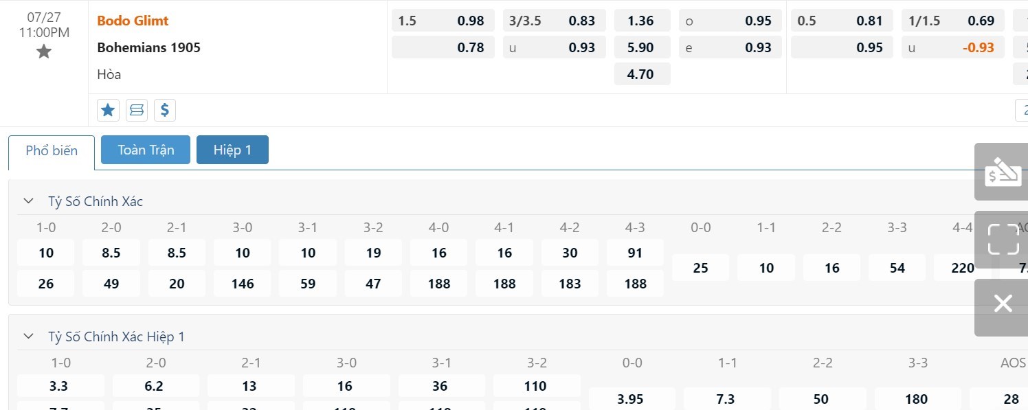 Tip kèo tỷ số hiệp 1: Bodo Glimt 1-0 Bohemians